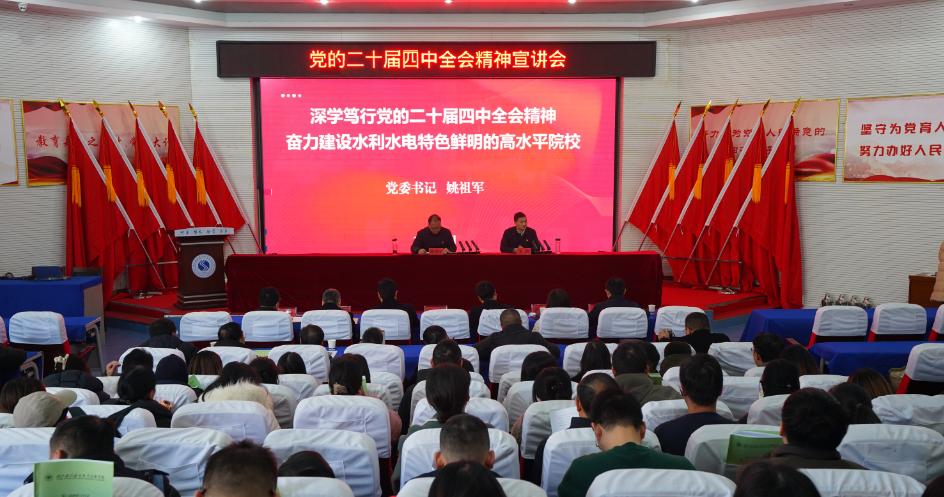 为持续推动学习贯彻党的二十届四中全会精神走深走实,营造全员深入学习、全面贯彻落实的浓厚氛围,1月24日上午,学院举行党的二十届四中全会精神宣讲会,学院党委书记姚祖军以《深学笃行党的二十届四中全会精神 奋力建设水利水电特色鲜明的高水平院校》为题讲授专题党课。学院党委副书记、院长张政主持会议。